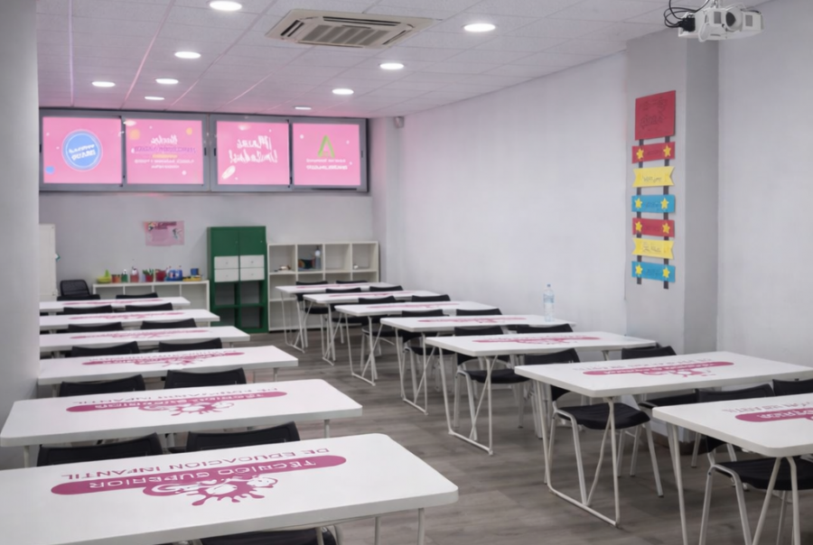 El centro cuenta con dos aulas totalmente equipadas en Almería, diseñadas para favorecer el aprendizaje práctico y colaborativo. Las instalaciones disponen de proyectores, mesas de trabajo para cada dos alumnos, aseos y sistema de aire acondicionado, creando un entorno cómodo, funcional y adaptado a la formación profesional en Educación Infantil. Además, existe parking público de pago cercano, lo que facilita el acceso diario al centro.